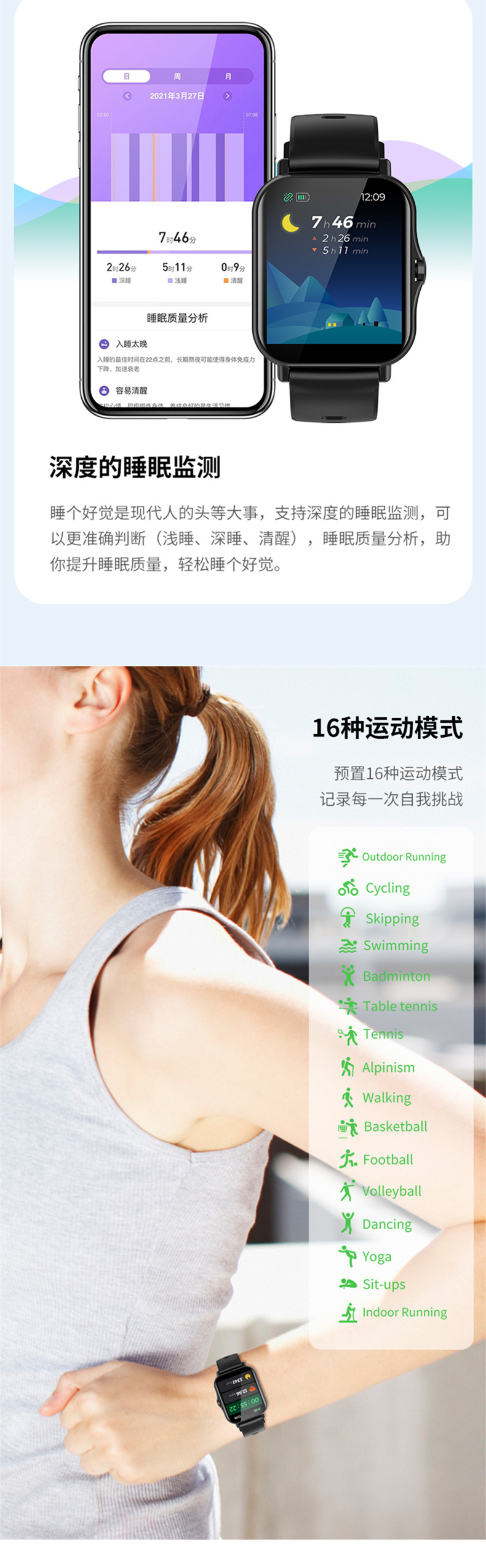 | 睡眠模式 | 對睡眠進行檢測,記錄睡眠時長 | |